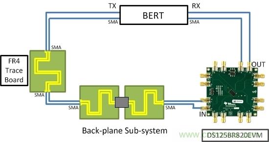 這一切聽起來很棒,但該工具能給您帶來可靠的結果嗎?為了回答這個問題,筆者去了實驗室,并進行了一些測量。筆者決定使用一個速率為12.5Gbps的Linear re-driver DS125BR820EVM、一些FR4印刷電路板(PCB)走線以及具有SMA連接器、適用于背板子系統(tǒng)的子卡。圖1展示了筆者的簡單設置。使用一個誤碼率測試器(BERT)作為為本次研究的發(fā)送器及接收器)。