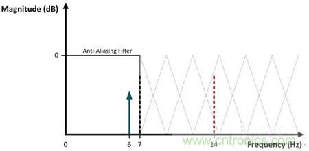 大多數(shù)ADC之前都會有一個抗混疊濾波器,而這個濾波器與衰減信號(超過了所需帶寬)的低通濾波器沒有什么不同。如圖4所示,一個理想抗混疊濾波器的響應在那奎斯特頻率之前是絕對水平的,在這個頻率之后,它迅速滾降,以衰減帶外頻率。在這里,采樣率已加倍至14SPS,這將7Hz的那奎斯特頻率和原始6Hz輸入安全的放置在通頻帶之內。
