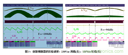 圖3和4分別是實驗波形和內置[2]的LM-FOT調制器的400W PFC [8]與這款創(chuàng)新的調制器的性能比較。