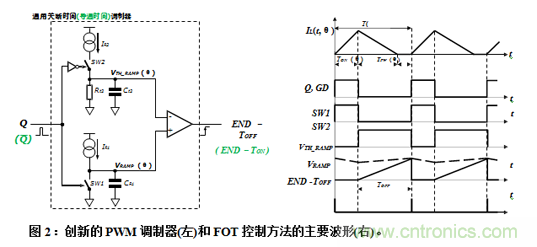 本文介紹一種創(chuàng)新的自適應穩(wěn)壓器(AC/DC或DC/DC)脈寬調制器(PWM),基于“固定關斷時間(FOT)”或“恒定導通時間(COT)”控制方法,可以在全工況下(例如,滿負載CCM或中低負載DCM模式,寬輸入輸出電壓)以恒定開關頻率工作,無轉換器的寄生參數(例如,功率開關和濾波電感器的電阻)的負面影響。此外,本文提出的調制器電路與轉換器拓撲無關(升壓、降壓、反激式等),只與功率開關管柵極驅動邏輯信號(GD)有關,節(jié)省芯片引腳數量,且/或降低設計復雜程度。