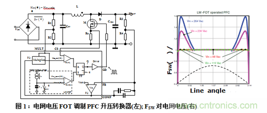 例如,用FOT方法控制CCM PFC前級升壓穩(wěn)壓器,導致開關頻率隨電網電壓和負載條件而發(fā)生明顯變化[1]。按照實時電網電壓調制關斷時間,可以降低開關頻率(TOFFKt Vin, pksinθ), 如圖1所示,只要升壓級是CCM模式,最終開關頻率是恒定的[2],如圖1右圖所示。