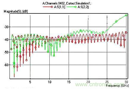 圖7圖8對比,在用ROGERS板材做隔層處理之后,相比未做隔層處理回波損耗下降到-30dB之內(nèi),大大降低了回波損耗,保證了信號傳輸?shù)耐暾?/div>
