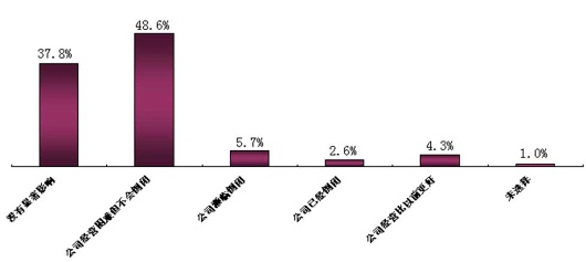 一個(gè)公司能否健康地發(fā)展,領(lǐng)導(dǎo)層的作用至關(guān)重要。常言道,滄海橫流方顯英雄本色,在經(jīng)濟(jì)牛市中,考驗(yàn)的是企業(yè)決策人的遠(yuǎn)見(jiàn)和膽識(shí),在經(jīng)濟(jì)熊市中,就更需要企業(yè)領(lǐng)導(dǎo)層的聰明才智。此次調(diào)查顯示,超過(guò)64.3%的電子工程師給了自己的企業(yè)領(lǐng)導(dǎo)層很正面的評(píng)價(jià),從這個(gè)結(jié)果來(lái)看,我們的電子行業(yè)的工作和諧程度還是較高的!
