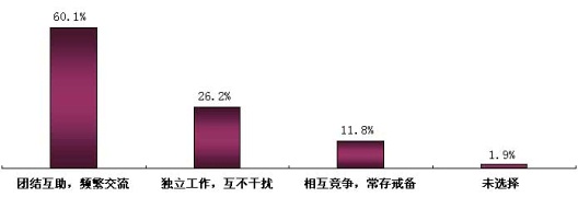 為了更深入了解電子工程師的生存環(huán)境,我們特意設(shè)置了這個(gè)問(wèn)題。對(duì)每一位工程師來(lái)說(shuō),同事關(guān)系處理的如何,直接影響著他們的工作質(zhì)量和生活質(zhì)量,良好的同事關(guān)系,利人利己,利公利私。特別讓我們欣慰的是,60.1%的電子工程師和同事處于團(tuán)結(jié)互助,頻繁交流的工作狀態(tài),在目前經(jīng)濟(jì)危機(jī)的陰霾籠罩下,這樣同事關(guān)系顯的尤為重要。(見(jiàn)圖表七)