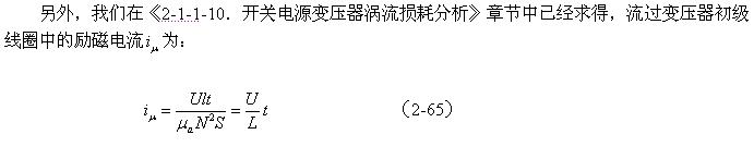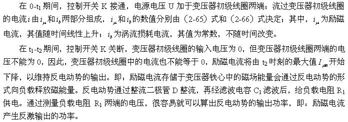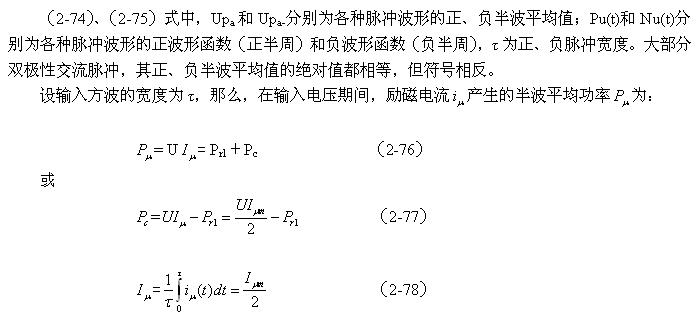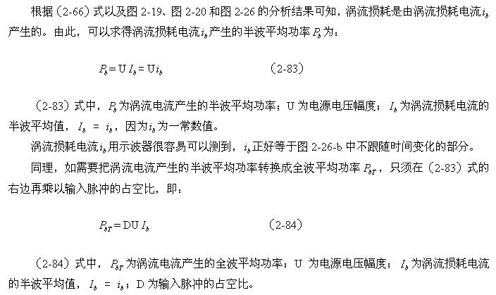 順便指出:(2-84)式的結(jié)果,是認為渦流損耗在t1-t2期間(圖2-26-b)完全等于0而求得的,但實際上,在t1-t2期間變壓器初級線圈產(chǎn)生的反電動勢同樣也會在變壓器鐵芯中感應產(chǎn)生渦流損耗電流,即當輸入電壓為0時刻,在變壓器鐵芯中還存在很短暫時間的渦流損耗;由于這種渦流損耗是由反電動勢提供能量來維持的,它將隨著反電動勢能量的衰減很快就衰減到0。