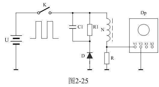 圖2-25中,U是電源電壓,通過控制開關K不斷地接通和關斷,就可以把電源電壓調(diào)制成單極性電壓脈沖;N為變壓器初級線圈,D為反激輸出整流二極管;R1為反激輸出負載電阻;C1為濾波電容;R為取樣電阻,通過測量R兩端的電壓,就可以知道流過變壓器初級線圈的電流;取樣電壓被送到示波器Dp進行顯示。