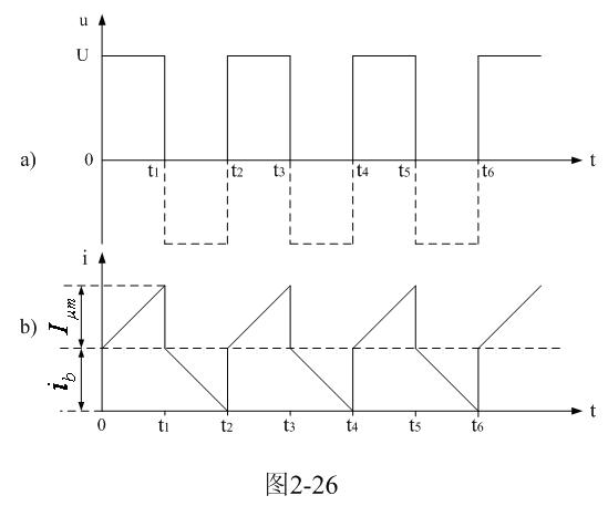 圖2-26是圖2-25電路中變壓器初級線圈兩端電壓以及電流波形圖。圖2-25中,通過改變控制開關K的占空系數(shù),可使變壓器初級線圈正好工作于電流臨界連續(xù)狀態(tài)或電流斷續(xù)狀態(tài),即:流過變壓器初級線圈中的電流在下一次控制開關K接通之前為0。