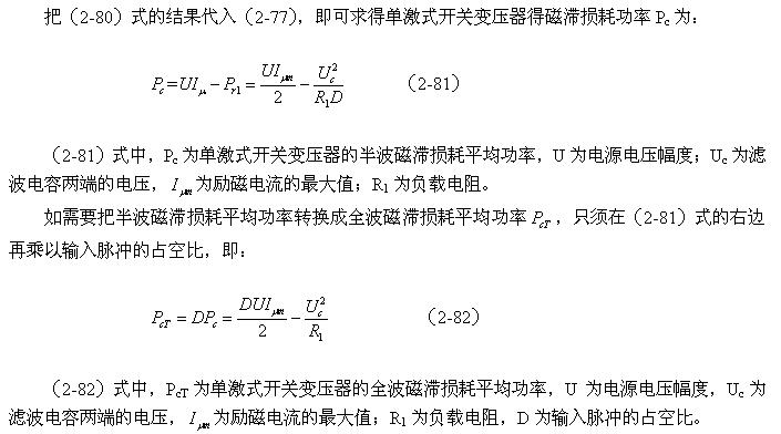 磁滯損耗半波平均功率Pc可根據(jù)(2-76)式或(2-77)式求得,不過在求Pc時,還須先求反激輸出電壓在負載電阻R1上的半波平均功率Pr1;而計算反激輸出電壓在負載電阻R1上的半波平均功率Pr1時,還得先求反激輸出電壓在負載電阻R1上的全波平均值Pra;而全波平均值Pra就是反激輸出電壓在負載電阻R1上損耗的功率。