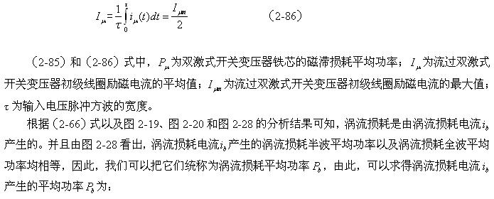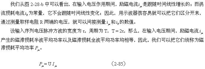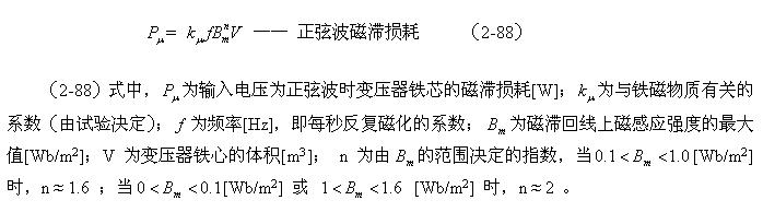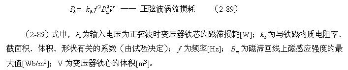 這里順便指出,利用(2-88)和(2-89)式來分別測試變壓器鐵心的磁滯損耗和渦流損耗是非常困難的;一個是它們的系數(shù)很難決定,另一個是兩者很難分別進(jìn)行測量,或從測量結(jié)果中進(jìn)行分離。對比兩式的參數(shù)就可以知道,它們之間最大的區(qū)別是頻率對損耗的影響程度;一個是與頻率成正比,另一個是與頻率的平方成正比。