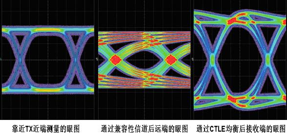 如下圖5所示,左邊的眼圖是靠近TX近端測(cè)量到的眼圖;中間的眼圖是通過兼容性信道(參考測(cè)試信道)后測(cè)量的眼圖,可見眼圖的張開程度較小,抖動(dòng)較大;右邊的眼圖是仿真CTLE均衡后的眼圖,可見眼高和抖動(dòng)都得到改善。