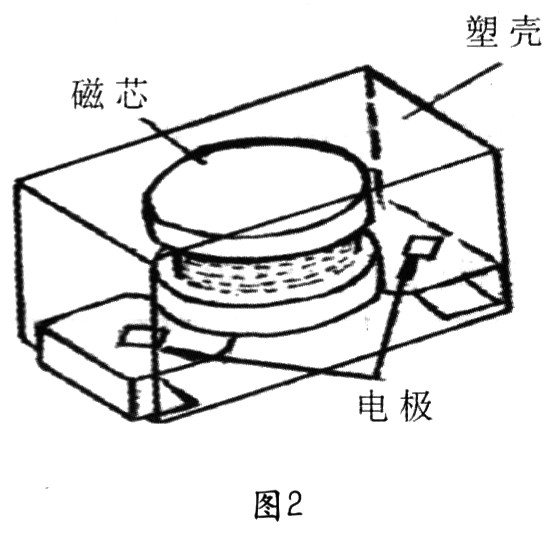 另一種形式的片式電感器是片式繞線電感器,這是對傳統(tǒng)繞線型電感器的一種改進,采用微小型工字型磁芯,經(jīng)繞線、焊接、電極成型、塑封等工序制成,見圖2。這種類型的片式電感生產(chǎn)工藝簡單,電性能優(yōu)良(電感量大,品質(zhì)因素高),適合于大電流通過,可靠性好。但受磁芯尺寸和制造工藝限制,進一步微小型有困難。