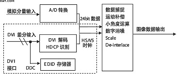 由原理圖看,數(shù)字電視增加DVI接口比較簡(jiǎn)單,從硬件電路考慮,一是在接口處增加DVI解碼部分,二是在后端提供一個(gè)數(shù)據(jù)通道,如果電視原有方案中具有A/D轉(zhuǎn)換和相應(yīng)的后級(jí)數(shù)據(jù)處理通道,那么DVI接口解碼輸出的數(shù)據(jù)可以與它共用,因?yàn)樵跀?shù)字信號(hào)格式一定的情況下,其碼率、行頻、場(chǎng)頻、時(shí)鐘是一致的。