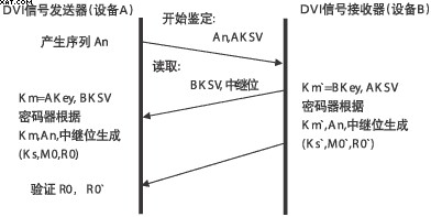 HDCP具體工作過程:首先由主機(jī)發(fā)送密鑰選擇導(dǎo)引序列(AKSV)和64bit偽隨機(jī)序列(An)到接收方,接收方回傳密鑰選擇導(dǎo)引序列(BKSV)和轉(zhuǎn)發(fā)器位(REPEAT-bit)(如是轉(zhuǎn)發(fā)器用以表示身份),發(fā)送方確認(rèn)BKSV是否已被廢除和是否包含20個(gè)1和20個(gè)0;如果雙方的設(shè)備密鑰和KSV有效,則計(jì)算產(chǎn)生一個(gè)56bit的公共密鑰Km和Km`,然后可產(chǎn)生KS、KS`(傳輸密鑰)、M0、MO`(64bit后續(xù)驗(yàn)證用追加初始序列)、RO、R0`(16bit指示驗(yàn)證成功,它必須在AKSV發(fā)送后100ms內(nèi)傳回發(fā)送方;驗(yàn)證成功后R01和R0相等;每128幀修正一次,每2s回傳一次)。因此當(dāng)DVI接口中斷傳輸2s以上,或是非授權(quán)設(shè)備接收時(shí),主機(jī)將停止傳輸內(nèi)容,以達(dá)到保護(hù)傳輸內(nèi)容的目的。HDCP鑒定處理過程如圖6所示。