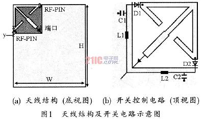 天線可以與手持設備電路板集成在一起,安裝在電路板的左上角,其結(jié)構和RF-PIN開關控制電路示意圖如圖1所示。
