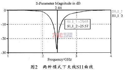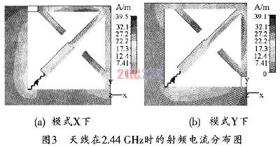 [page]由于兩種工作狀態(tài)下,天線的接地端不同,因此,天線的有效輻射部分也有所不同。當處于X模式時,天線結(jié)構中垂直部分的微帶線接地,因此,天線的輻射部分應該為水平部分的微帶,天線也相應工作在水平極化方式。圖3所示為天線在2.44GHz時的射頻電流分布圖。