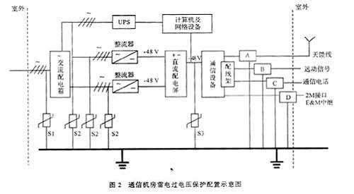 機(jī)房?jī)?nèi)專(zhuān)設(shè)交流配電箱。該處配電箱供電采用三相四線(xiàn)制供電,嚴(yán)格實(shí)現(xiàn)機(jī)房?jī)?nèi)各設(shè)備接地接零分開(kāi);安裝電源和信號(hào)避雷器,其避雷器接地采用合防雷器,S2為DEHNguard T385型電源2級(jí)防雷器,S3為DEHNrail 48FML型電源3級(jí)防雷器(直流48 V),A為UGK/N(2.5 G)天饋線(xiàn)防雷器,B為YG20-A音頻隔離變壓器,C為ZH型中和變壓器,D為同軸防雷器。