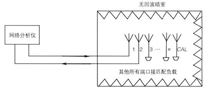 (3)將測量系統(tǒng)與被測天線的校準(zhǔn)端口和第i個饋電端口相連接,被測天線的其余端口一律接匹配負(fù)載,在工作頻率范圍內(nèi)進行傳輸系數(shù)S(i,CAL)的測量;