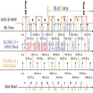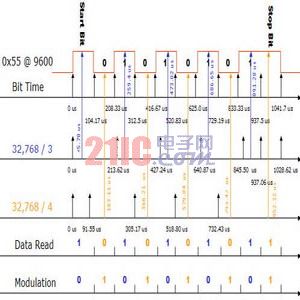 UART數(shù)據(jù)用10,922波特或8,192波特的UART接收。由于UART在傳輸中間點(diǎn)對數(shù)據(jù)進(jìn)行采樣以補(bǔ)償抖動,因此該點(diǎn)已經(jīng)被選擇為接收UART的采樣點(diǎn)。在沒有行抖動的理想情況下,10,922波特UART對第三數(shù)據(jù)位的開始兩次讀數(shù)都會是錯(cuò)誤的而8,192波特的UART由于會完全遺漏第三位,很快就將出錯(cuò)。由于低功耗應(yīng)用的理想時(shí)鐘是低功耗實(shí)時(shí)時(shí)鐘模式,這使得在低功耗環(huán)境中處理很困難。解決這一問題的最好辦法就是將µC與調(diào)制技術(shù)結(jié)合使用,用32kHz振蕩器提供非常精確的2,400波特,并完全能支持9,600波特(參見圖3)。