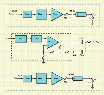 因此,直流耦合輸出信號(hào)可能是最劃算和直接的視頻信號(hào)耦合方法。此外,直流耦合還消除了輸出信號(hào)被兩次交流耦合的問(wèn)題:一次在濾波器/驅(qū)動(dòng)器的輸出端,另一次在媒體設(shè)備的輸入端。