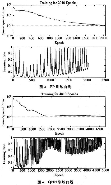 (3)確定量子與BP神經(jīng)網(wǎng)絡(luò)結(jié)構(gòu)和參數(shù):利用文獻(xiàn)[3]中算法建立量子神經(jīng)網(wǎng)絡(luò)。在實(shí)驗(yàn)中,網(wǎng)絡(luò)的輸入節(jié)點(diǎn)數(shù)為小波分解系數(shù)序列能量個(gè)數(shù),BP與QNN均為6,QNN與自適應(yīng)BP網(wǎng)絡(luò)均為3個(gè)輸出節(jié)點(diǎn)。隱層的選取及其它由設(shè)計(jì)者憑經(jīng)驗(yàn)和試驗(yàn)次數(shù)自行決定。本文經(jīng)過多次試驗(yàn),確定QNN與BP的隱層節(jié)點(diǎn)均為(15,15),QNN及BP的S型函數(shù)的斜率因子均設(shè)置為1.0,初始權(quán)值取為(-1,1)之間的隨機(jī)數(shù),期望誤差為0.01,初始學(xué)習(xí)速率為0.001,動(dòng)量因子MC為0.90,QNN的隱層采用具有38個(gè)量子能級(jí)的量子神經(jīng)元。在訓(xùn)練之前,利用主元分析降低網(wǎng)絡(luò)輸入維數(shù),主元分析在MATLAB里用princomp函數(shù)。