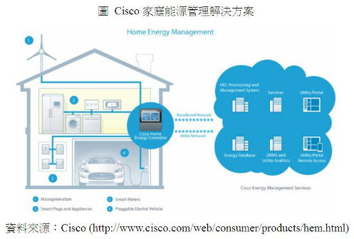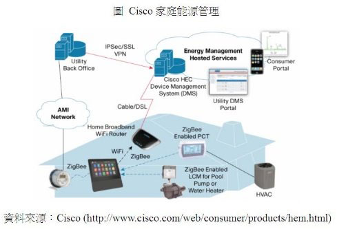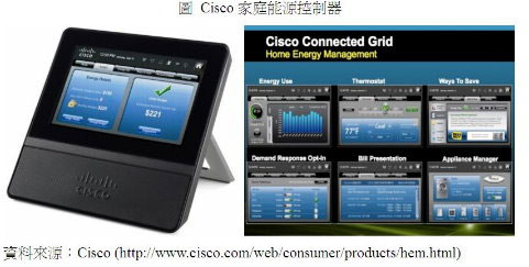 在綠色節(jié)能觀念的日益普及趨勢(shì)下,有效管理家中用電的家庭能源管理(Home Energy Management,HEM)成為智慧電網(wǎng)公共建設(shè)外,另一項(xiàng)具備高度發(fā)展?jié)摿Φ氖袌?chǎng)領(lǐng)域。面對(duì)民眾對(duì)節(jié)能管理的需求,現(xiàn)階段陸續(xù)已有許多國(guó)際大廠投入相關(guān)應(yīng)用與服務(wù)的研發(fā);除了Google推出PowerMeter的用電監(jiān)測(cè)網(wǎng)路平臺(tái)外(需搭配智慧電表或插座等設(shè)備),Cisco與Intel也陸續(xù)搭上平板電腦熱潮,推出協(xié)助民眾管理家庭用電的HEM裝置。相較于Google PowerMeter,Cisco與Intel所推出產(chǎn)品是以物聯(lián)網(wǎng)(Internet of Things,IoT)概念為基礎(chǔ),透過(guò)無(wú)線網(wǎng)路模式連結(jié)家中各項(xiàng)電器設(shè)備,進(jìn)行用電資訊的傳遞與監(jiān)控,同時(shí)進(jìn)行遠(yuǎn)端遙控動(dòng)作。 Cisco推出包含家庭能源控制器(Home Energy Controller,HEC)與能源管理服務(wù)平臺(tái)的家庭能源管理解決方案(Home Energy Management Solution,HEMS),作為進(jìn)入家庭節(jié)能市場(chǎng)的第一步。 HEC如同家庭中的監(jiān)控中心,除了可以在螢?zāi)簧霞磿r(shí)顯示家中用電的即時(shí)狀態(tài)資訊外,使用者透過(guò)觸控面板的HEC還可以對(duì)連線的家電產(chǎn)品進(jìn)行操控,決定是否關(guān)閉或調(diào)整特定家電來(lái)節(jié)省電力消耗。