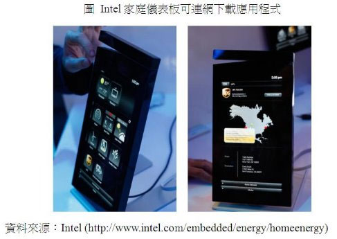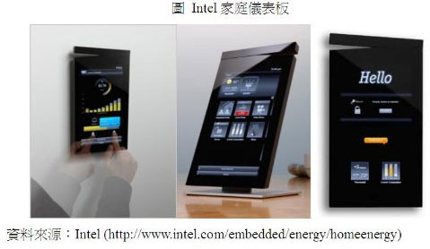 在家庭能源管理的概念下,Intel也推出暫稱為「家庭儀表板(Home Dashboard)」的整合性解決方案,產(chǎn)品設(shè)計(jì)為一個(gè)具備運(yùn)算能力且低耗能的平板電腦。 Intel規(guī)劃此產(chǎn)品成為家庭網(wǎng)路的核心(Heart of the Home Network),使用者可與智慧家電、智慧插座、智慧電表與家中各項(xiàng)感測(cè)裝置進(jìn)行連結(jié)與監(jiān)控動(dòng)作,并進(jìn)行家電設(shè)備的安全設(shè)定、溫控設(shè)定、電源
