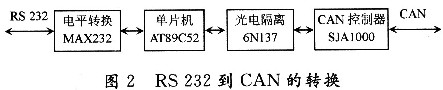 RS232串口的幀格式為:1位起始位,8位數(shù)據(jù)位,1位可編程的第9位(此位為發(fā)送和接收的地址/數(shù)據(jù)位),1位停止位。而CAN的數(shù)據(jù)幀格式為:幀信息+ID+數(shù)據(jù)(可分為標準幀和擴展幀兩種格式)。因此,設(shè)計時就需要有一個微控制器來實現(xiàn)電平和幀格式等的轉(zhuǎn)換,其轉(zhuǎn)換方式如圖2所示。