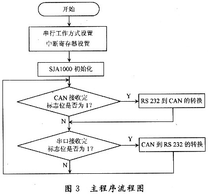 在微處理控制下,RS232和CAN進行數(shù)據(jù)交換時,采用串口接收和CAN中斷方式可提高工作效率。SJAl000的初始化在復位模式下才可以進行,主要包括工作方式的設(shè)置、時鐘分頻和驗收濾波寄存器的設(shè)置、波特率參數(shù)的設(shè)置以及中斷允許寄存器的設(shè)置等。其主程序流程圖如圖3所示。