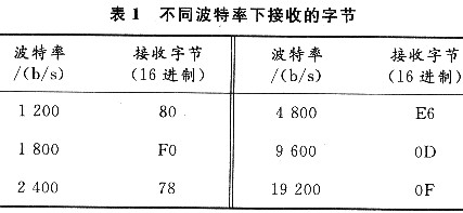 檢測轉(zhuǎn)換裝置的串口波特率,首先可對主機的接收波特率(以9600b/s為例)進行設(shè)定,并在終端發(fā)送一個特定的字符(以回車符為例),這樣,主機根據(jù)接收到的字符信息就可以確定轉(zhuǎn)換裝置的通信波特率?;剀嚪腁SCII值是0DH,在不同波特率下接收到的值如表1所列。[page]