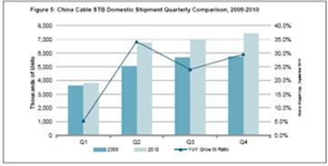 2010年中國(guó)有線機(jī)頂盒出貨量將達(dá)到2510萬(wàn)個(gè),比2009年的2010萬(wàn)個(gè)增長(zhǎng)24.8%。由于各省有線電視運(yùn)營(yíng)商加快發(fā)展用戶,以及小型運(yùn)營(yíng)商推動(dòng)客戶從模擬向數(shù)字服務(wù)過(guò)渡,預(yù)計(jì)第二季度創(chuàng)下全年的最強(qiáng)勁增長(zhǎng)水平。2010年第二季度有線機(jī)頂盒出貨量增長(zhǎng)到680萬(wàn)個(gè),比2009年同期的500萬(wàn)個(gè)增長(zhǎng)34%。