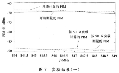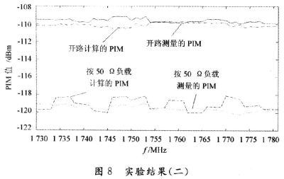 由以上的分析可知,這種計算方法計算出來的PIM值和真實的PIM值十分接近,并且隨頻率的變化趨勢一致。同時可以看出,在開路的時候所測量的 PIM明顯要比接負載的時候所測量的PIM要大,增大的PIM值是因為匹配不好所造成,當然,相同的負載狀況在不同的頻率下呈現(xiàn)的匹配狀態(tài)是不一樣的。