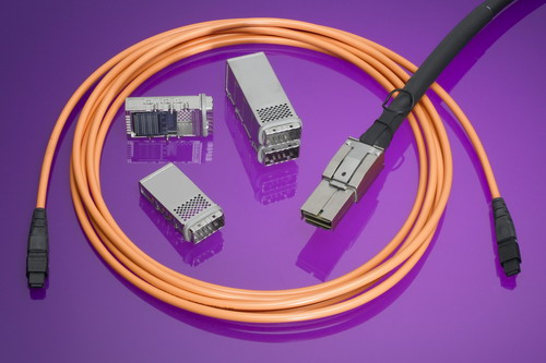 有源光纜組件:CXP 有源光纜(AOC)組件和可插拔收發(fā)器模塊采用了12個發(fā)射(TX) 和 12 個接收 (RX)通道,在多模光纖上提供每通道10 Gbps的數(shù)據(jù)速率,傳輸距離長達1km (3280.840’)。光纜終端的光電轉換由包含了專門針對低功耗和高可靠性而優(yōu)化的光引擎的集成式收發(fā)器模塊來完成。