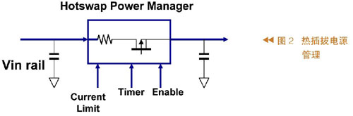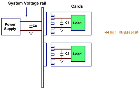 圖1所示為熱插拔過程,其中左邊代表系統(tǒng)及其供電,在供電的輸出端有一個電容,右側(cè)有兩張卡,這些卡的輸入端也有電容。把卡插入系統(tǒng)之前,輸入電容沒有被充電;當(dāng)把卡插入系統(tǒng)時會有一個很大的瞬間電流向輸入電容充電,這么大的瞬時電流很可能造成系統(tǒng)供電電壓不正常。