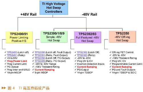 TI推出了很多熱插拔產(chǎn)品,并且多個產(chǎn)品中加入了特殊功能以提升熱插拔的工作功率,這能夠使熱插拔MOS管工作在安全區(qū),從而提高產(chǎn)品可靠度、降低成本。另外一個功能就是di/dt(電流上升的速率),這能夠減少噪音和對電路零件的沖擊。TI的熱插拔產(chǎn)品主要分為兩類:高壓熱插拔產(chǎn)品,針對48V、-48V或24V應(yīng)用;低壓熱插拔產(chǎn)品,針對3V到15V的應(yīng)用。