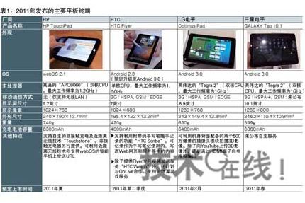 2011年1月,美國摩托羅拉移動公司(Motorola Mobility)發(fā)布了配備Android 3.0的平板終端“XOOM”,以此為開端,2011年2月韓國LG電子和三星電子分別發(fā)布了“Optimus Pad”和“GALAXY Tab 10.1”。HTC采用Android 2.3投產(chǎn)的首款平板終端“HTC Flyer”計劃升級至Android 3.0(表1)。2010年收購了美國Palm的美國惠普(Hewlett-Packard)也涉足了平板終端市場,并于2011年2月發(fā)布了“HP TouchPad”,采用Palm面向智能手機OS開發(fā)的“webOS”。