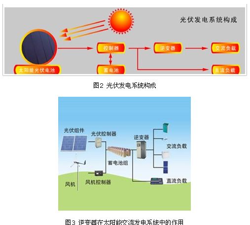 太陽能交流發(fā)電系統(tǒng)是由光伏組件、光伏控制器、蓄電池組和逆變器共同組成(如圖1),,其中,逆變器是最重要的部分。逆變器是一種電源轉(zhuǎn)換裝置,其主要功能是將蓄電池的直流電逆變成交流電,圖2表示了逆變器在太陽能交流發(fā)電系統(tǒng)中的作用。