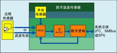 溫度數(shù)據(jù)變?yōu)榭捎盟璧臅r(shí)間稱為轉(zhuǎn)換速率。該速率由器件內(nèi)部振蕩器和A/D分辨率決定,一般低于100Hz或長于10ms。轉(zhuǎn)換速率越快,溫度數(shù)據(jù)可檢索的速度就越快,同時(shí)溫度傳感器消耗的功率也就越大。由于存在自加熱效應(yīng),轉(zhuǎn)換速率通常較低。圖1顯示了一個(gè)遠(yuǎn)程溫度傳感器和/或本地溫度傳感器的簡化框圖。