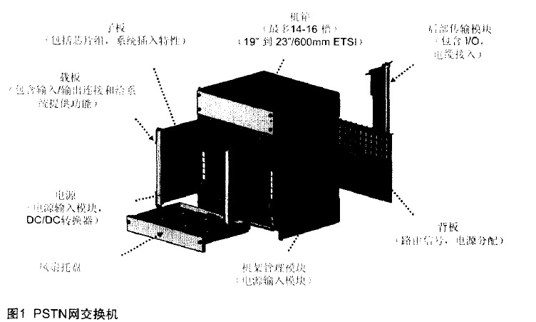 圖1所示為一個PSTN網(wǎng)的交換機,該交換機由7個部分組成。除了機箱尺寸的區(qū)別,機箱底部是一個機架的管理模塊,它包括管理模塊、傳輸背板和傳輸模塊。最前面有子板、載板、電源板,以及風(fēng)冷系統(tǒng)、電扇托板。在交換機中,它的主要載板就是電話信息的傳輸以及輸入/輸出的連接,輸入,輸出系統(tǒng)所組成的只有很少的電腦板以及信令控制板。
