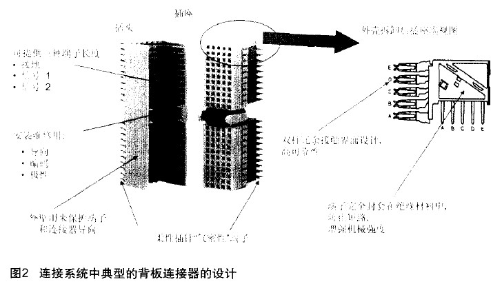 圖2是典型的連接系統(tǒng)中背板連接器的設(shè)計。它可以提供三種端子長度,即接地端子、信號1端子、信號2端子三個端子的長度是不同的。這是為了保證插座和插針在互相連接的時候,如果接反了,就無法插入。第二個是中問部分,它是用于安裝維修用的,整個插針板在插入的過程中,可以用來導(dǎo)向,甚至可以保證編碼和極性的正確。外壁用來保護端子和連接器的導(dǎo)向,這個端子就是插針部分,采用柔性插針。從右半部分圖中可以看到,外殼被拆除后,更清楚地顯示出了接觸面。它采用了雙柱冗余的接觸面設(shè)計,這樣可以大大提高接觸的可靠性。