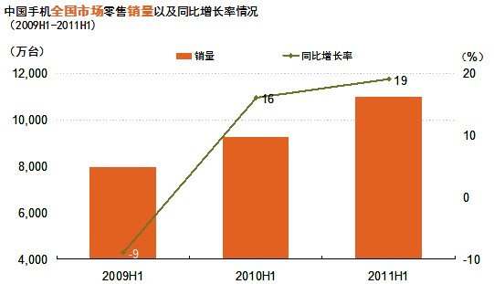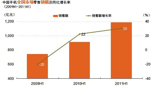 2011年上半年手機市場繼續(xù)保持較快增長。據(jù)GfK(捷孚凱中國)全國零售監(jiān)測數(shù)據(jù)顯示,2011年上半年銷售量已達到1.1億臺,同比增長19%,銷售額達到1186億元,銷售額同比增長30%。