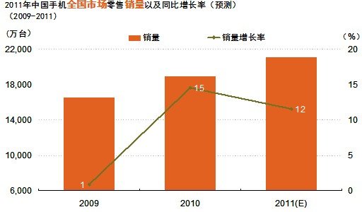 2011年上半年中國的手機市場在3G加速發(fā)展,智能手機大力推廣以及運營商的推動共同作用下延續(xù)了2010年的增長勢頭,但是2011年下半年的手機市場規(guī)模與上半年相比將略有下降,銷量將達到1.02億臺,銷售額將達到1166億元。據(jù)GfK預(yù)測,2011年全年手機銷售額將達到2352億元,手機銷量將達到2.1億臺,同比上升12%。