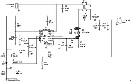 構(gòu)建起如圖3 所示電路,并對(duì)其進(jìn)行描述。該電路可在汽車(chē)市場(chǎng)獲得應(yīng)用。這里,其擁有一個(gè)8V 到36V 的寬范圍輸入,可以為穩(wěn)定12-V 輸出以上或者以下。汽車(chē)市場(chǎng)更喜歡使用陶瓷電容器,原因是其寬溫度范圍、長(zhǎng)壽命、高紋波電流額定值和高可靠性。結(jié)果,耦合電容器(C6) 便為陶瓷的。這就意味著,相比電解電容器,它擁有較高的AC 電壓,同時(shí)這種電路會(huì)對(duì)低漏電感值更加敏感。