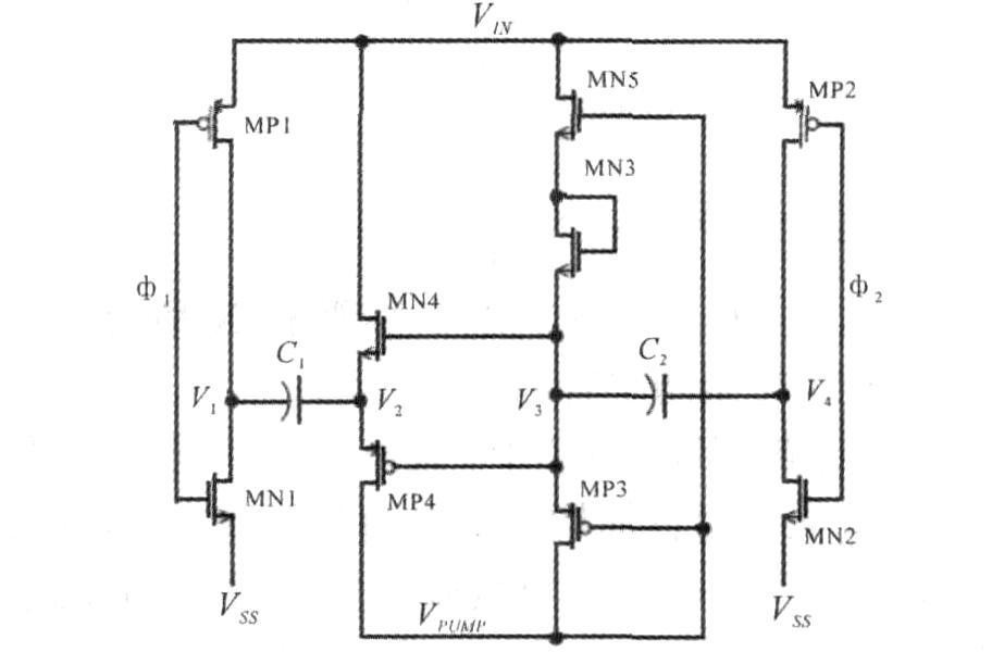 自舉電荷泵不需要為MN2和MP2提供柵驅(qū)動電壓,控制簡單,但輸出電壓會有一個閾值損失。圖3是改進后的電荷泵電路圖,1和2為互補無交疊時鐘。由MN2、MN5、MP3、MP2和電容C2組成的次電荷泵為MN4、MP4提供柵壓,以保證其完全關斷和開啟。當1為低電平時,MP1導通,電位增加,此時,V3電位為零,MP4導通,V2上的電荷轉(zhuǎn)移到柵電容CGATE上,VPUMP電位升高。當1為高電平時,MP2導通,為C2充電,V4電位上升至電源電位,V3電位隨之上升,MP3導通,VPUMP電位繼續(xù)升高。MN3相當于二極管,起單向?qū)щ姷淖饔谩?br />