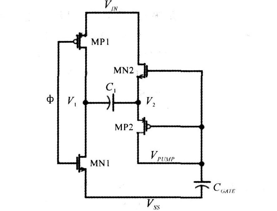 圖2為一種自舉型(SelfBoost)電荷泵的電路原理圖。圖中,為時鐘信號,控制電荷泵工作。初始階段電容,C1和功率管柵電容CGATE上的電荷均為零。當為低電平時,MP1導通,為C1充電,V1電位升至電源電位,V2電位增加,MP2管導通。假設柵電容遠大于電容C1,V2上的電荷全部轉(zhuǎn)移到柵電容CGATE上。當為高電平時,MN1導通,為C1左極板放電,V1電位下降至地電位,V2電位下降,MP2管截止,MN2管導通,給電容C1右極板充電至VIN。在的下個低電平時,V1電位升至電源電位,V2電位增加至2VIN,MP2管導通,VPUMP電位升至2VIN-VT。