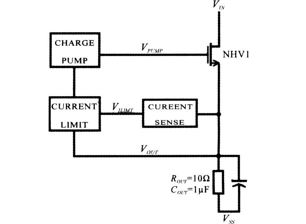 圖1為USB電源開關的整體設計。其中,VIN為電源輸入,VOUT為USB的輸出。在負載正常的情況下,由電荷泵產(chǎn)生足夠高的柵驅(qū)動電壓,使NHV1工作在深線性區(qū),以降低從輸入電源(VIN)到負載電壓(VOUT)的導通損耗。當功率管電流高于1A時,Currentsense輸出高電平給過流保護電路(Currentlimit);過流保護電路通過反饋負載電壓給電荷泵,調(diào)節(jié)電荷泵輸出(VPUMP),從而使功率管的工作狀態(tài)由線性區(qū)變?yōu)轱柡蛥^(qū),限制功率管電流,達到保護功率管的目的。當負載恢復正常后,Currentsense輸出低電平,電荷泵正常工作。