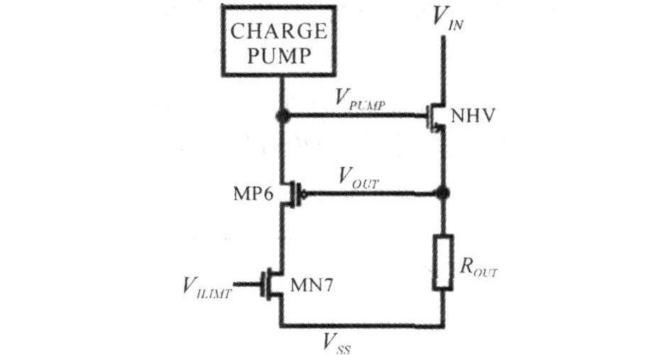 當出現(xiàn)過載和短路故障時,負載電流達到數(shù)安培,需要精確的限流電路為功率管和輸入電源提供保護。對于MOS器件,只有工作在飽和區(qū)時的電流容易控制。限流就是通過反饋負載電壓,調(diào)節(jié)電荷泵輸出電壓來實現(xiàn)的。圖4是限流電路的原理圖。