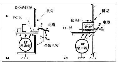 即使工程師采取許多上述所列的預(yù)防措施,來減小在I/O區(qū)內(nèi)的RF噪聲,還不能保證這些預(yù)防措施能否成功地足夠滿足發(fā)射要求。有些噪聲是傳導(dǎo)干擾,即在內(nèi)部電路板上按共模電流流動。這個干擾源是在底板和電路等之間。于是,這個RF電流一定通過最低阻抗(在底板和載信號線之間)的通路流動。如果連接器沒呈現(xiàn)足夠低的阻抗(與底板的搭接處),這RF電流經(jīng)雜散電容流動。當這RF電流流過電纜時,不可避免地產(chǎn)生發(fā)射(圖1A)。