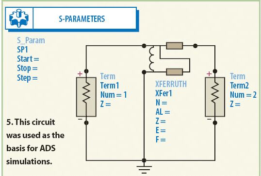 為了對變壓器響應進行散射參數(shù)(S參數(shù))仿真,ADS采用它的S_Param建模器,按照規(guī)定的步長和刻度步長調節(jié)初始(開始)的和最終(停止)的掃頻頻率。源和負載阻抗由一個阻抗值為Z的、被稱為Term的特殊終端表示。圖5所示為ADS仿真中所用的電路。