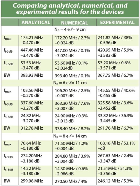 構建的第一個器件線圈匝數(shù)為4,因此傳輸線長度為9cm。圖8、9和10分別顯示了分析、數(shù)值和實驗三種情況下的頻率插損行為。表中總結了主要的參數(shù)值,包括最大幅值、-3dB頻率(fmax、fi-3dB和fs-3dB)、適當?shù)膸挘˙W),以及相比模型值頻率偏差百分比下的各種插損結果。通過分析、數(shù)值和實驗方法獲得的結果間的偏差非常小,信號頻率最大時例外。這都是由于測量設置中噪聲和其它寄生效應造成的測試系統(tǒng)的局限性。在幅度基本穩(wěn)定的測試頻帶上,信號電平的變化是幾乎察覺不到的,也許這就是最大信號幅度頻率的報告中出現(xiàn)偏差的原因。