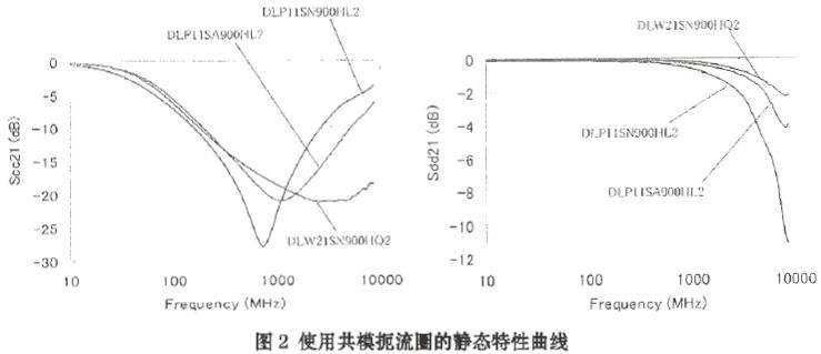 現(xiàn)在把共模扼流圈在信號線上和時鐘線上測試其噪音并因此確定受到的影響。在1080p或12位深色的最高信號頻率為1.11GHz上,對數(shù)據(jù)傳輸進(jìn)行評價。圖2所示為共模轉(zhuǎn)換特性,特別是Scc21,在此消除的噪音但增加了與其成比例的Scc21的量值,以及差分模式傳輸特性和影響信號波形跌幅成比例的Sdd21。在此采用共模扼流圈進(jìn)行評價。